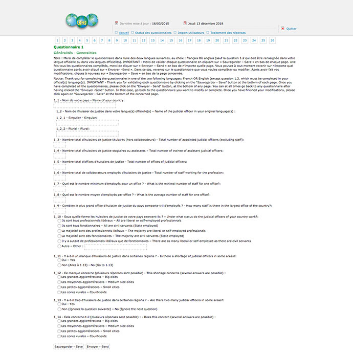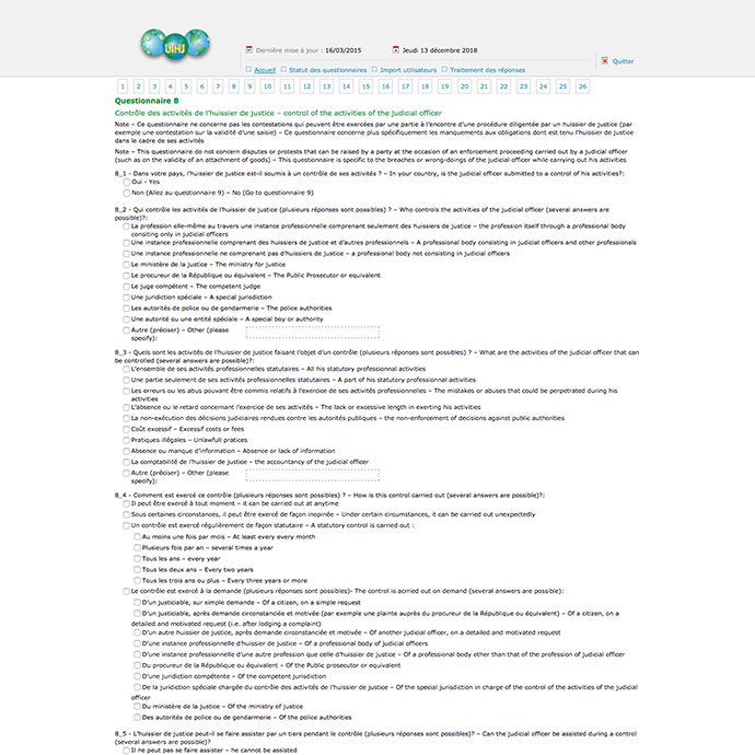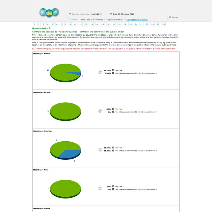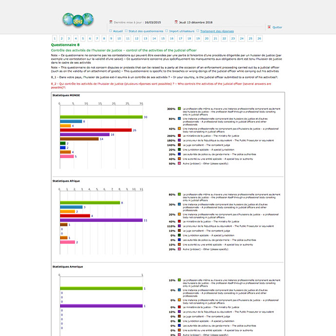 Les quelques 75 représentations nationales membres de l'Union internationale des huissiers de justice ont « toutes » repondu directement en ligne au sondage concernant leur profession dans leur pays. Les données recueillies d'une cinquantaine de questions en français-anglais de diverses thématiques sont traitées directement par la présentation du résultat de l'enquête. Ce dernier prendra la forme de taux, d'histogrammes, de chiffres, de moyennes… consolidées par continent et au détail.